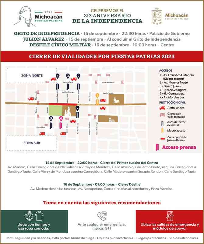 Morelia, Michoacán, 14 de septiembre de 2023.- Con motivo de las fiestas patrias, a partir de las 22:00 horas de este jueves 14 de septiembre, se habilitarán siete accesos para ingresar al Primer cuadro del Centro Histórico de Morelia, a efecto de preservar la seguridad de la población que asiste a los festejos.