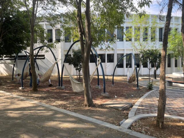 El espacio que está cubierto para evitar el sol y la lluvia, cuenta con módulos de estudio, hamacas, sillas colgantes, estación de monitoreo y mesetas.
