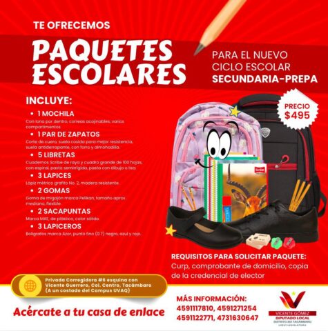 Morelia, Michoacán. 1 de agosto de 2025. En apoyo a la economía familiar se inició la entrega de paquetes escolares subsidiados a familias de la región que tienen hijas e hijos en primaria, secundaria y preparatoria, informó el diputado por el Distrito XIX con sede en Tacámbaro.